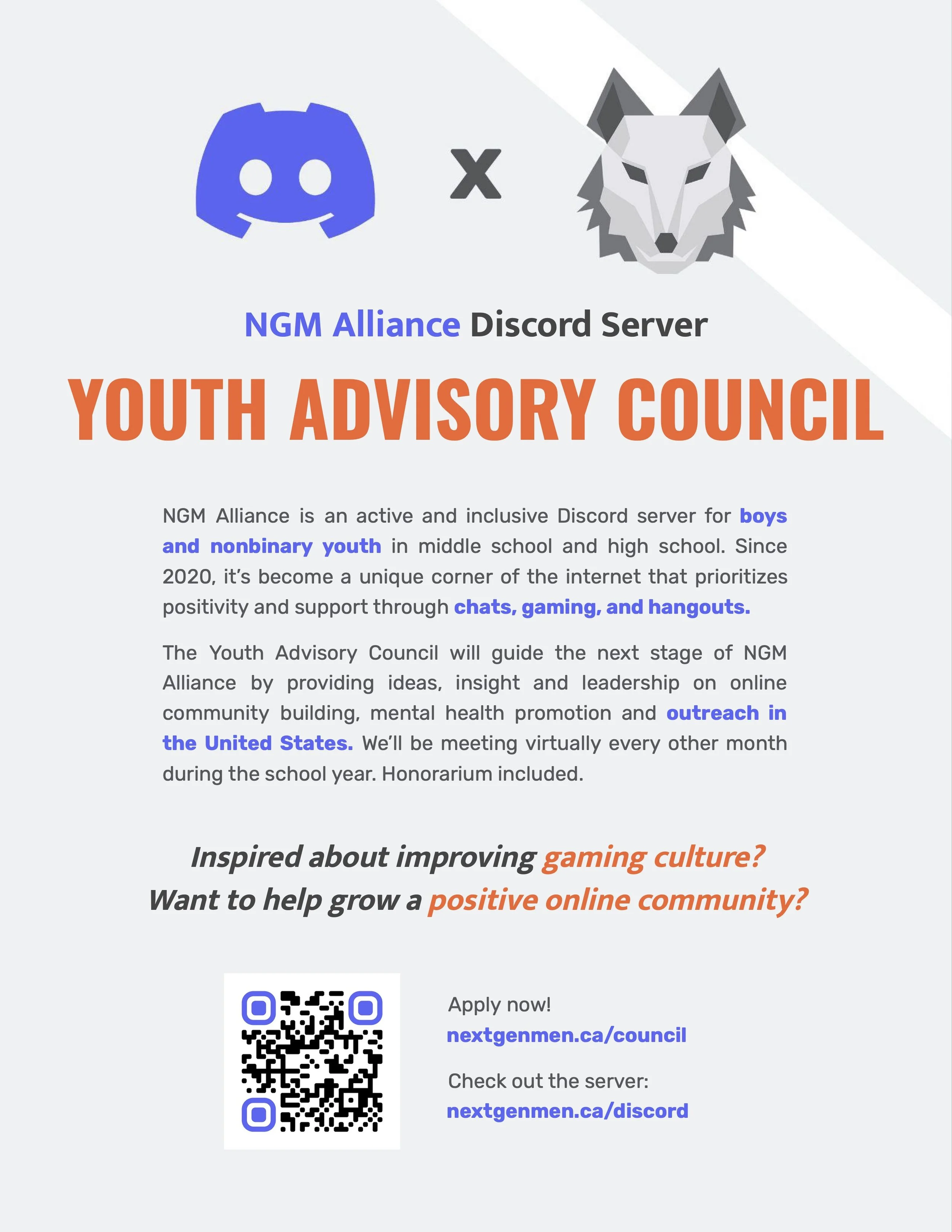 • The Discord server is facilitated and moderated by three Next Gen Men youth staff team: Jonathon Reed, our Youth Program Manager (BA, BEd, MEd); Stephanie Wright, our Youth Program Lead (BSc); and our Youth Program Coordinator (currently pursuing a BSW). All staff working with Next Gen Men youth programs undergo a vulnerable sector screening.